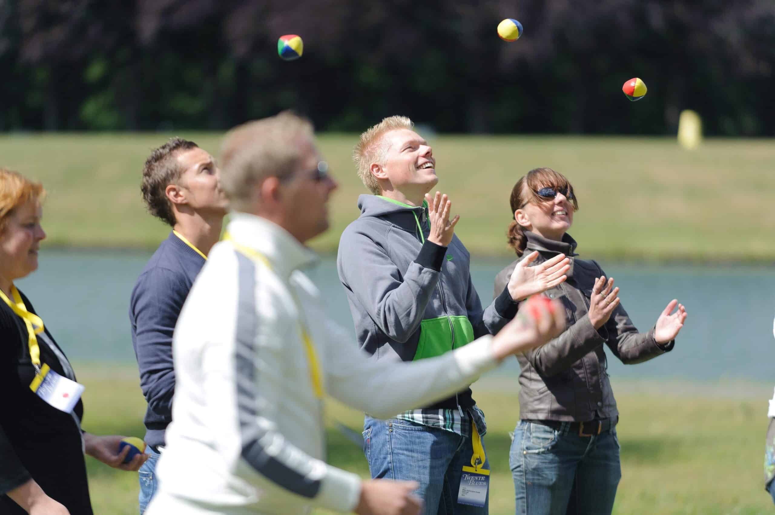 Na een korte, spectaculaire introductie – waarin wordt laten zien hoe ver “de gekte die jongleren heet” kan gaan – gaan de deelnemers zelf aan de slag. Stap voor stap, van één bal naar meerdere ballen. Deelnemers motiveren en stimuleren elkaar, leren van fouten en groeien samen. En ja… bijna iedereen lukt het uiteindelijk om met drie ballen te jongleren!