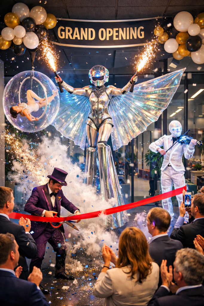 Naast originele en heerlijke catering, gezellige muziek en bijzonder entertainment, vindt natuurlijk een prachtige openingsact plaats, speciaal afgestemd op het bedrijf. Wij werken samen met specialisten in het creeëren van spectaculaire openingsacts.