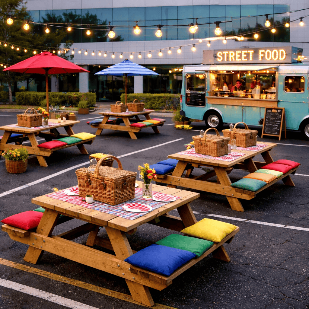 Stel je voor: het parkeerterrein of buitenterrein van uw bedrijf verandert in een gezellige zomer picknick met festival sfeer.