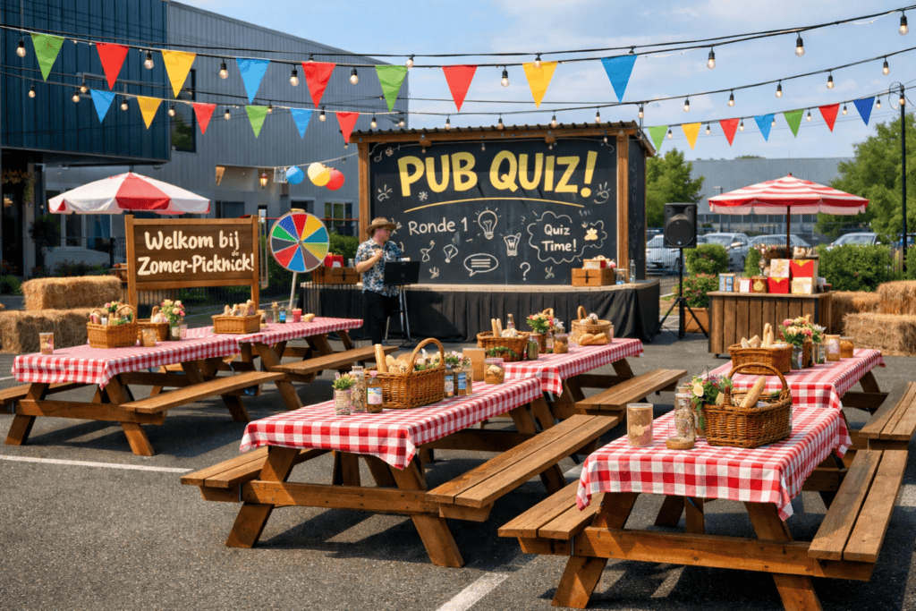 Picknicktafels met vrolijke tafelkleedjes, manden vol lekkernijen, kleurrijke vlaggetjes en een enthousiaste quizmaster die iedereen meeneemt in een hilarische pubquiz.